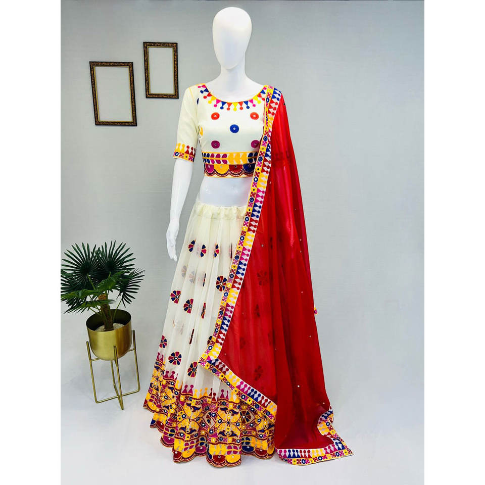 PARTY WEAR GEORGETE EMBROIDERY WITH MIRROR WORK LEHENGA CHOLI WITH DUPATTA WHITE
