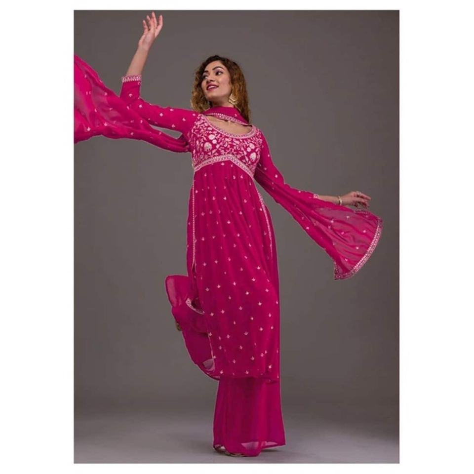 PARTY WEAR GEORGETTE EMBROIDERY SEQUENCE WORK NAYRA CUT TOP BOTTOM WITH DUPATTA PINK