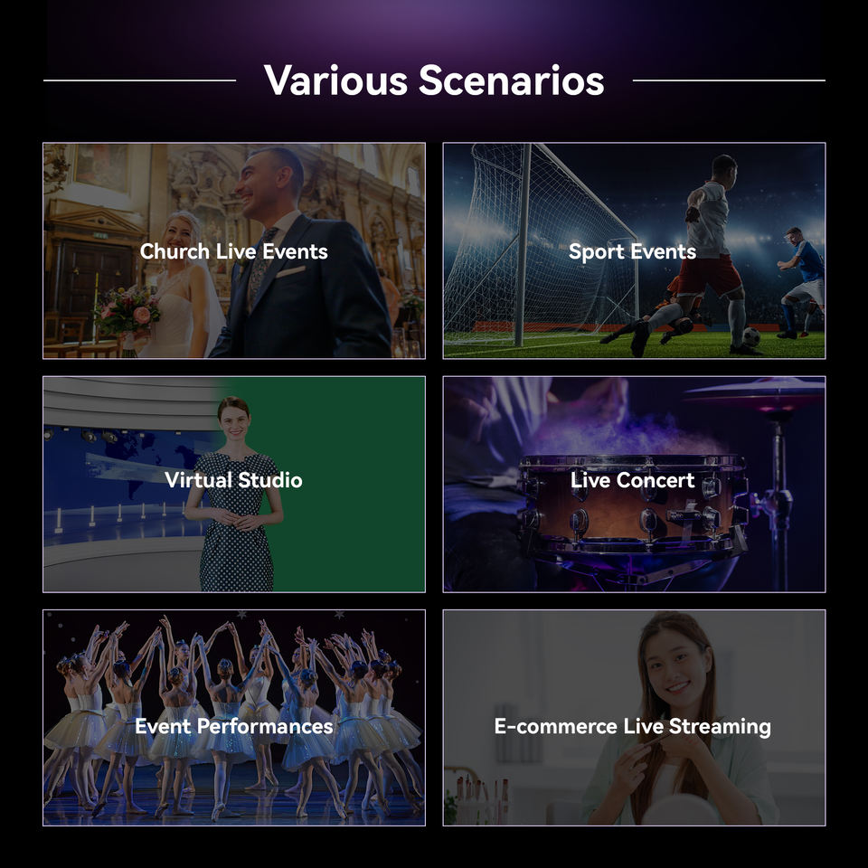 Commutation/mixage, enregistrement, lecture, montage, diffusion en continu, contrôle de caméra PTZ