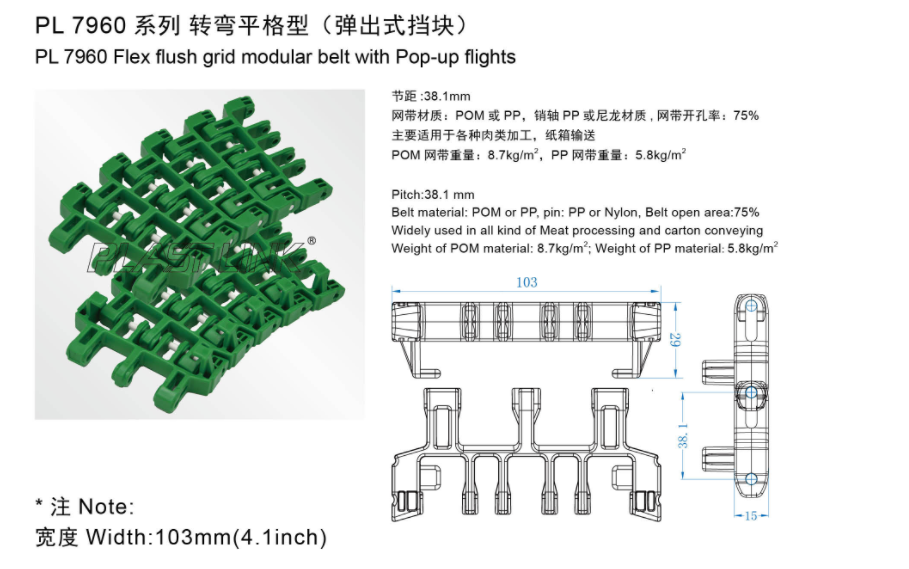 PLASTLINK PL 7960 Courroie modulaire à grille affleurante flexible pour petit convoyeur avec vols escamotables Matériau Nylon pour magasins d'alimentation