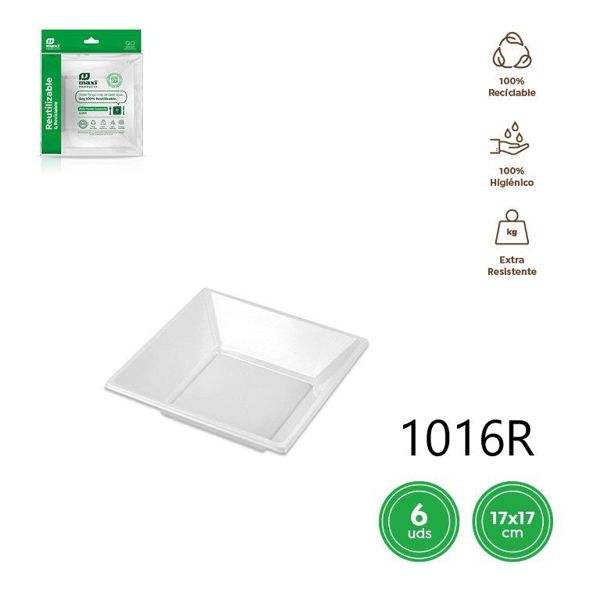 Plateau en plastique jetable PLATO HONDO 1016R, forme carrée 17x17cm, réutilisable, 6 unités, blanc, assiettes jetables pour plats à emporter