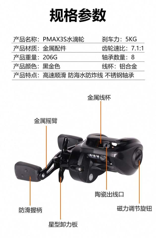 Moulinet de pêche baitcasting PMAX3S étanche pour droitier, haute vitesse, système de freinage magnétique, utilisation lac et rivière, corps en plastique, métal 7.1:1