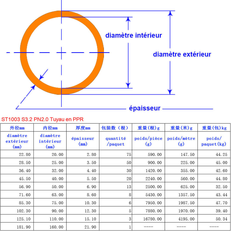 Tuyau d'eau choude/froide en PPRNom