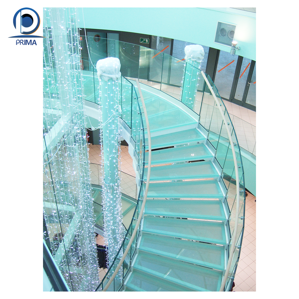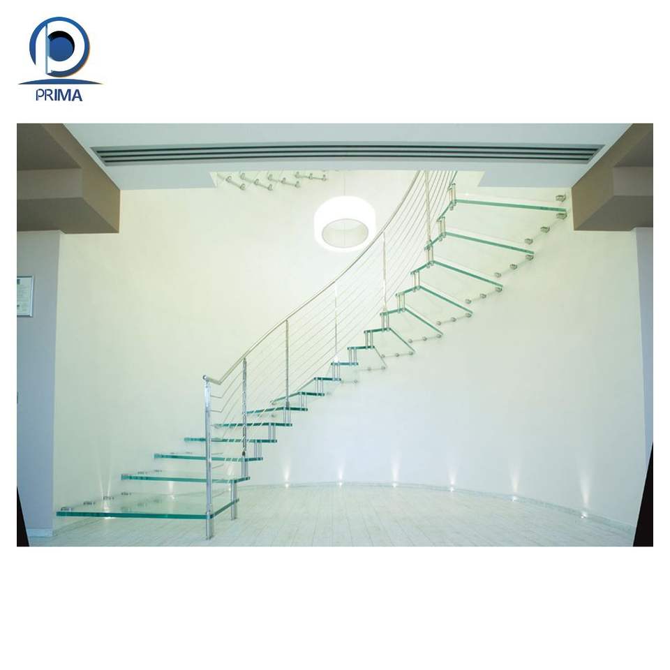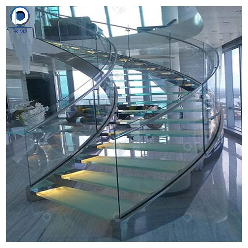 Escalier de villa incurvé en acier galvanisé de conception moderne personnalisée haut de gamme PRIMA, marches fermées en verre trempé, durable