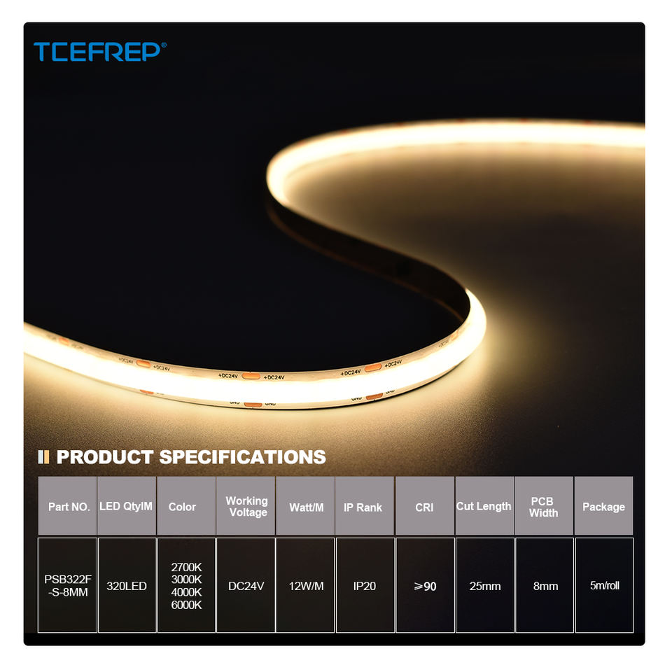 Bande LED haute puissance PSB322F S 8MM de large, 320 LED, 135LM/W, DC 24V, 12W, 5M, CRI élevé Ra 90 pour éclairage linéaire