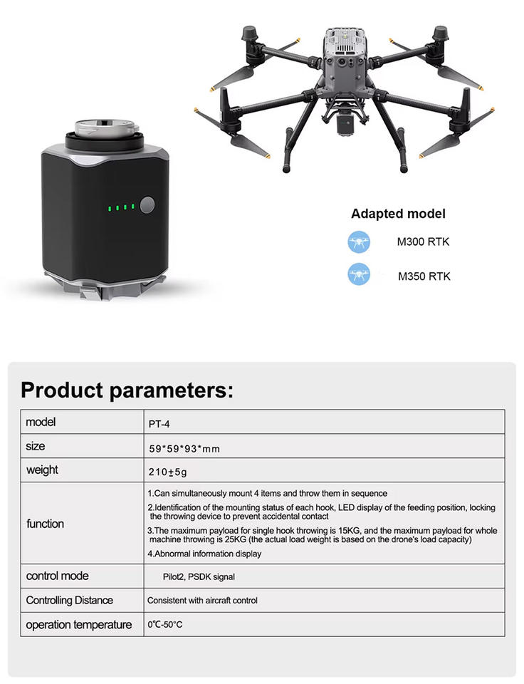 Système de livraison aérienne de secours PT-4 pour drone DJI M300 & M350 RTK, charge utile maximale de 25 kg, kit de largage, crochet de largage, lanceur à quatre étapes