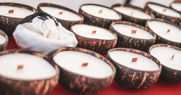 Bougie parfumée à la cire de noix de coco pure dans une coquille naturelle, combustion propre, parfum écologique pour la maison