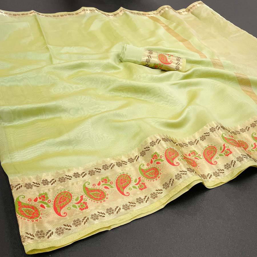 PURE MERCERISED ORGANZA SILK SAREE WITH BLOUSE PARTY WEAR LIGHT GREEN