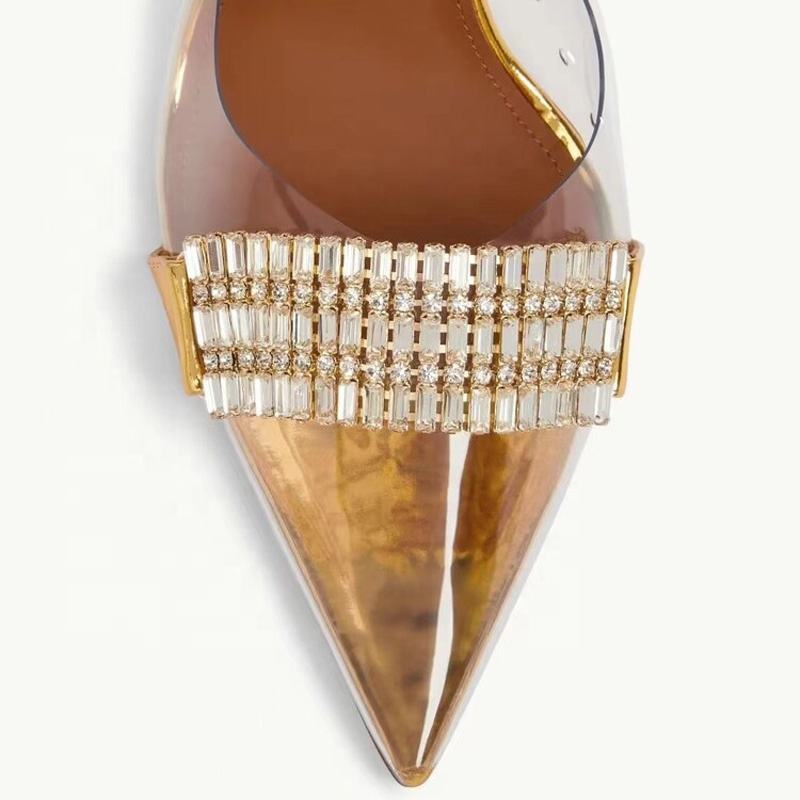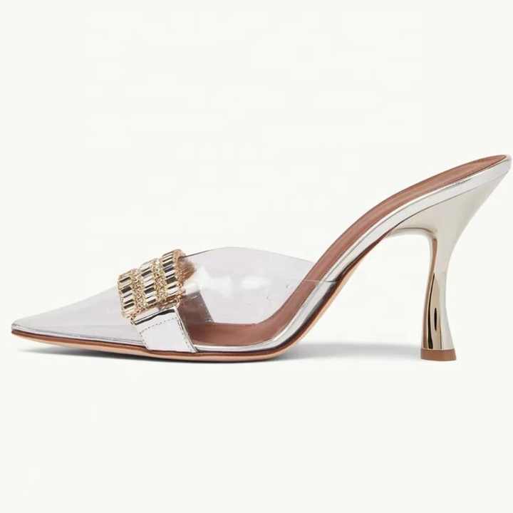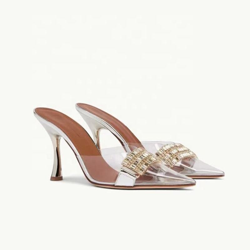 Mules à talons fins en PVC pour femmes, sandales transparentes à diamants, chaussures sexy et tendance, pantoufles de soirée argentées pour femmes