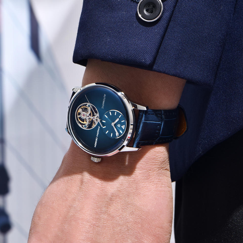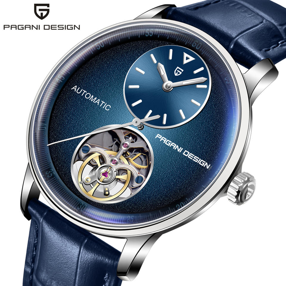 Montre mécanique automatique Pagani Design pour homme, tourbillon, verre bleu, boîtier en acier inoxydable, bracelet en cuir, épaisseur 14 mm, 100 m