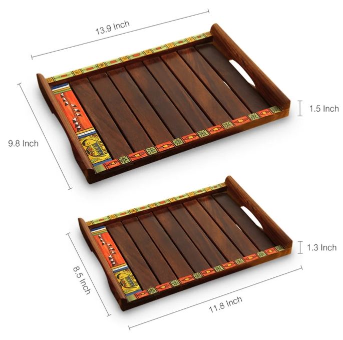 Peintures et planches Madhubani Plateaux imbriqués peints à la main en bois de Sesham Plateau rond en bois Farmhouse & Vintage Centerpiece