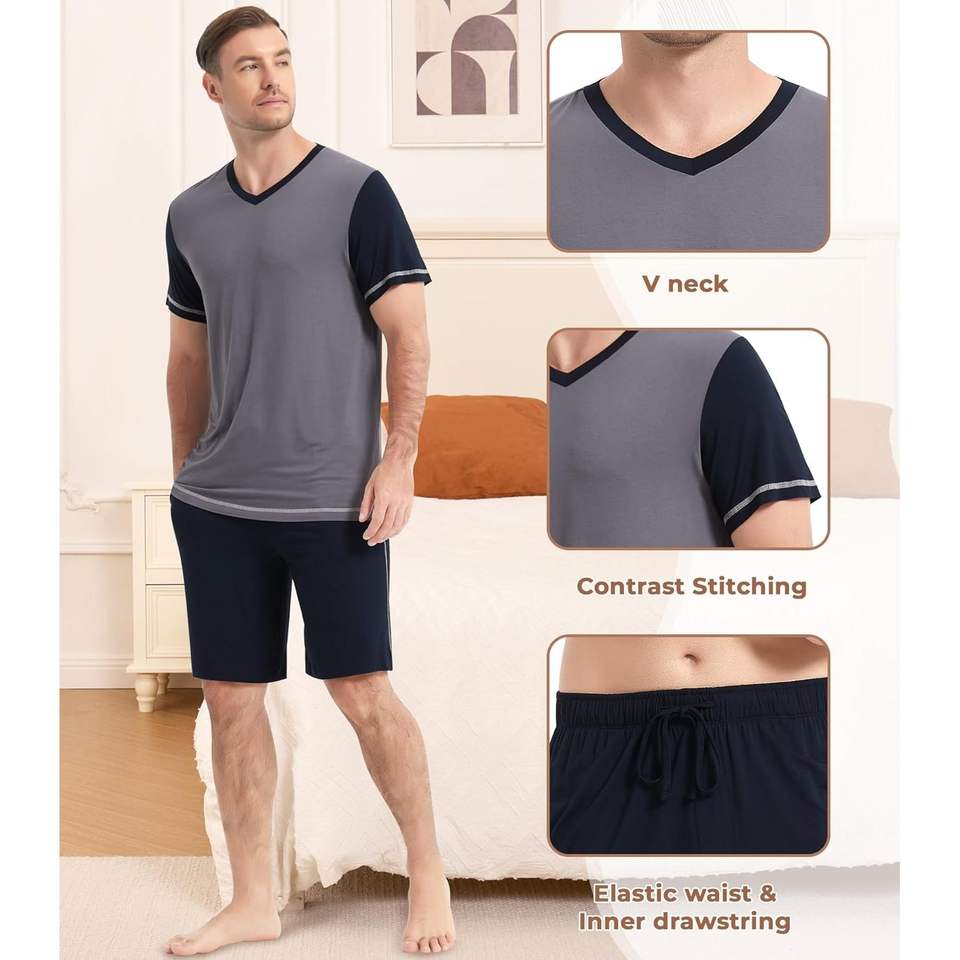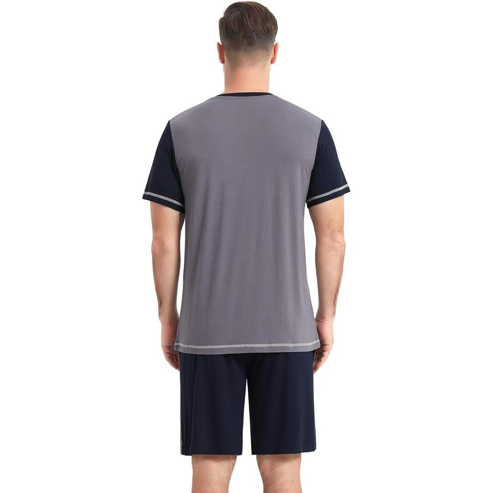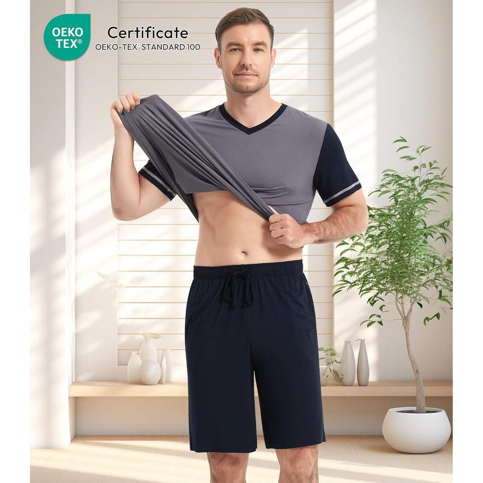 Pyjama pour homme à manches courtes, col en V, avec short, ensemble de vêtements de détente respirant en coton tricoté et fibre de bambou