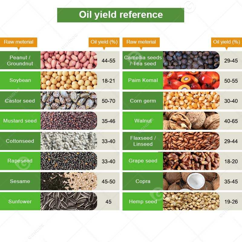 Almond oil, Huile d'avocat, Huile de basilic, Huile de noix de coco, Huile de germe de maïs, Huile de coton, huile de graine d'asphalte, Huile d'arachide, Huile de moutarde, Huile d'olive, Huile de palme, Huile d'arachide, D'huile de noix de pin, Huile de graines de citrouille, Rap d'huile de graine, Huile de colza, Huile de graines de carthame, Huile de sésame, Huile de soja, Huile de graines de tournesol, Huile de graines de thé, Huile de noix de coco de Vierge, Huile de noix, Huile de germe de bléType d'huile