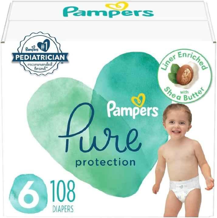 Pampers Pure Protection Couches 6 XXL Fourniture d'un mois (108 pièces) Hypoallergénique Premium Jetable Couches pour bébé en coton imprimé