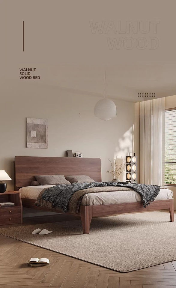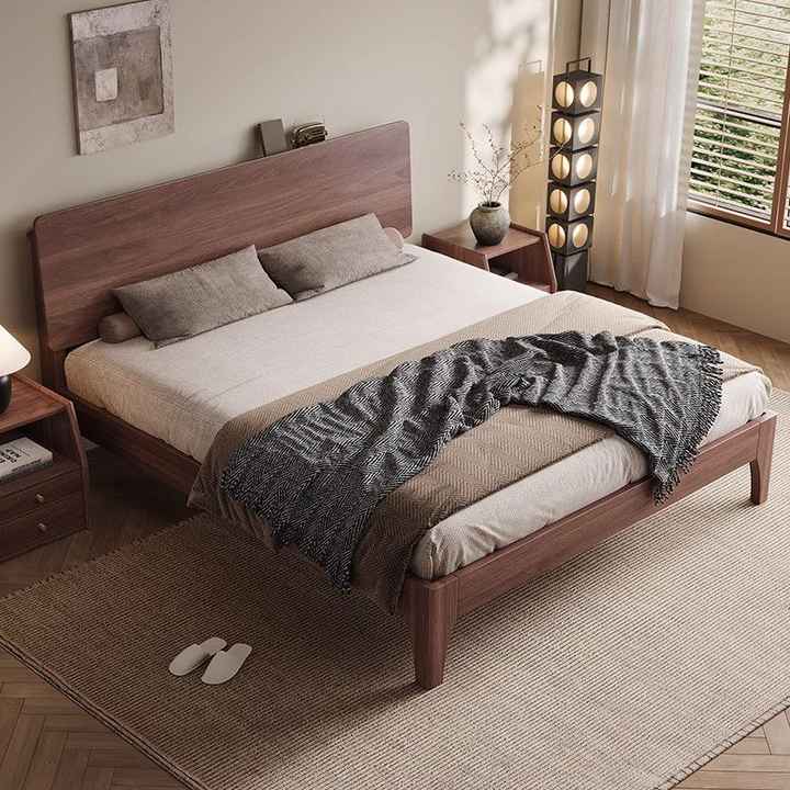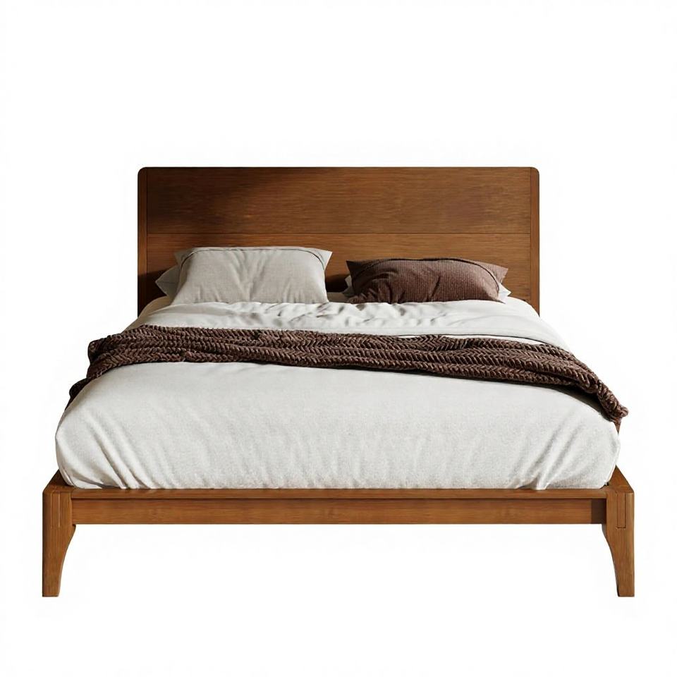 Lit plateforme en bois avec tête de lit haute de style moderne du milieu du siècle, support en contreplaqué, aucun sommier tapissier nécessaire