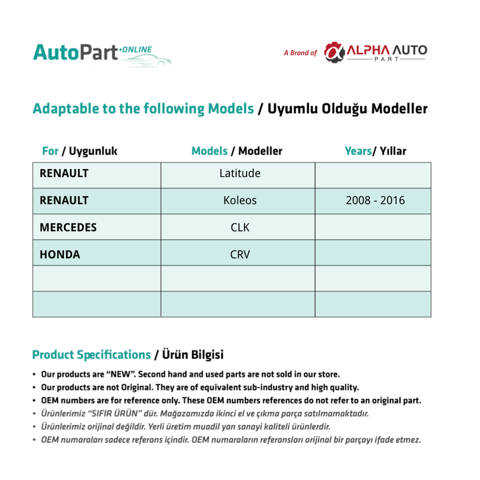 Kit de réparation de toit panoramique en verre pour Renault Latitude (expédition du fabricant turc) Code produit: SR2260