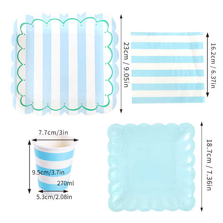 assiettes : 7+9 po, tasses : 9,5 oz, serviettes : 33 cm