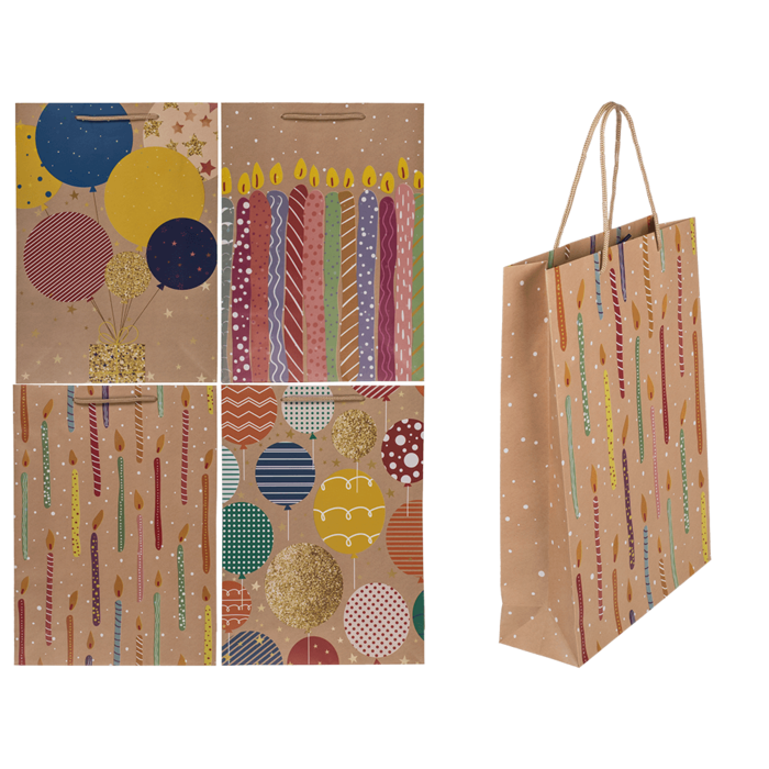 Sac cadeau en papier, ballons et bougies,