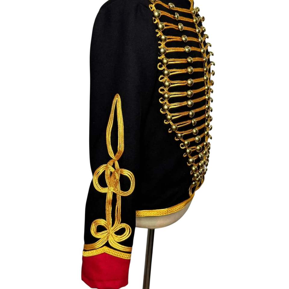 Veste de parade, au design en coton noir avec des tresses et des boutons dorés inspirés des uniformes des hussards napoléoniens