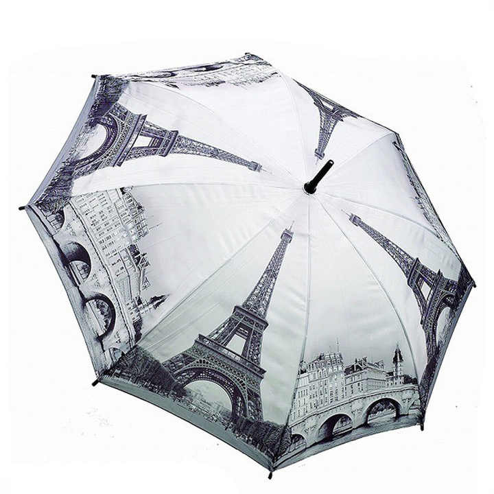 Parapluie droit coupe-vent personnalisé avec impression par sublimation RPET, motif Tour Eiffel de Paris, cadeau promotionnel personnalisé, protection UV