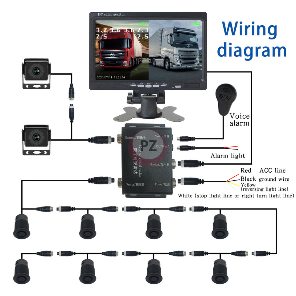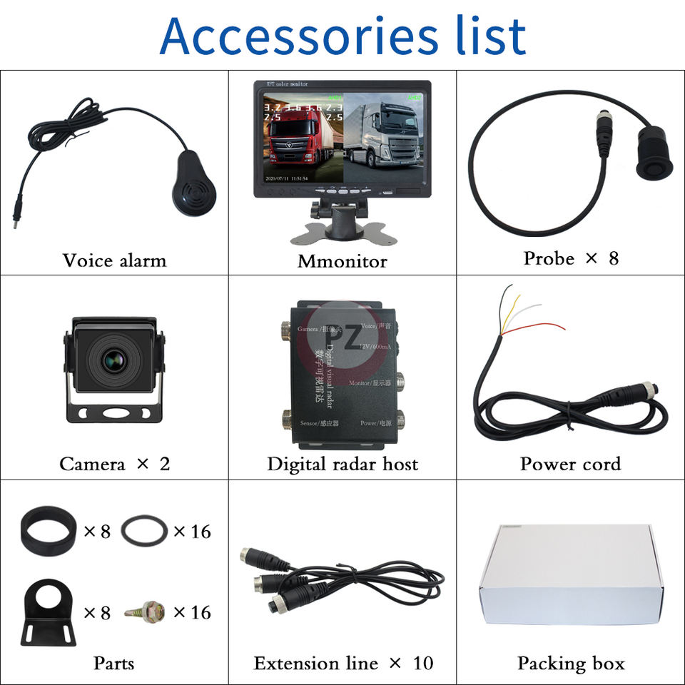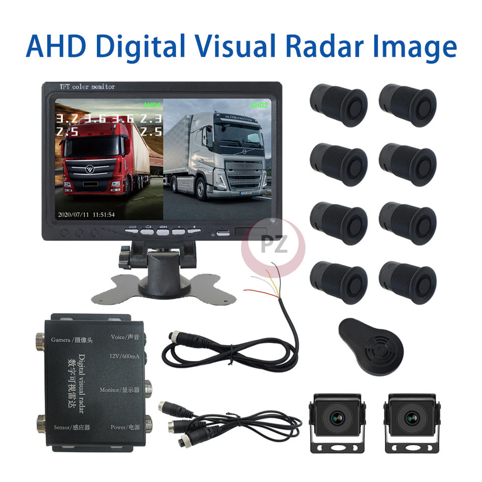 Assistant de stationnement moniteur 7 pouces avec 2 caméras alarme de vue avant/arrière 8 capteurs Kit de système de stationnement d'avertissement de recul pour camion