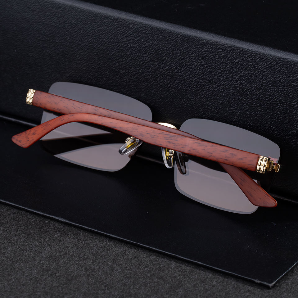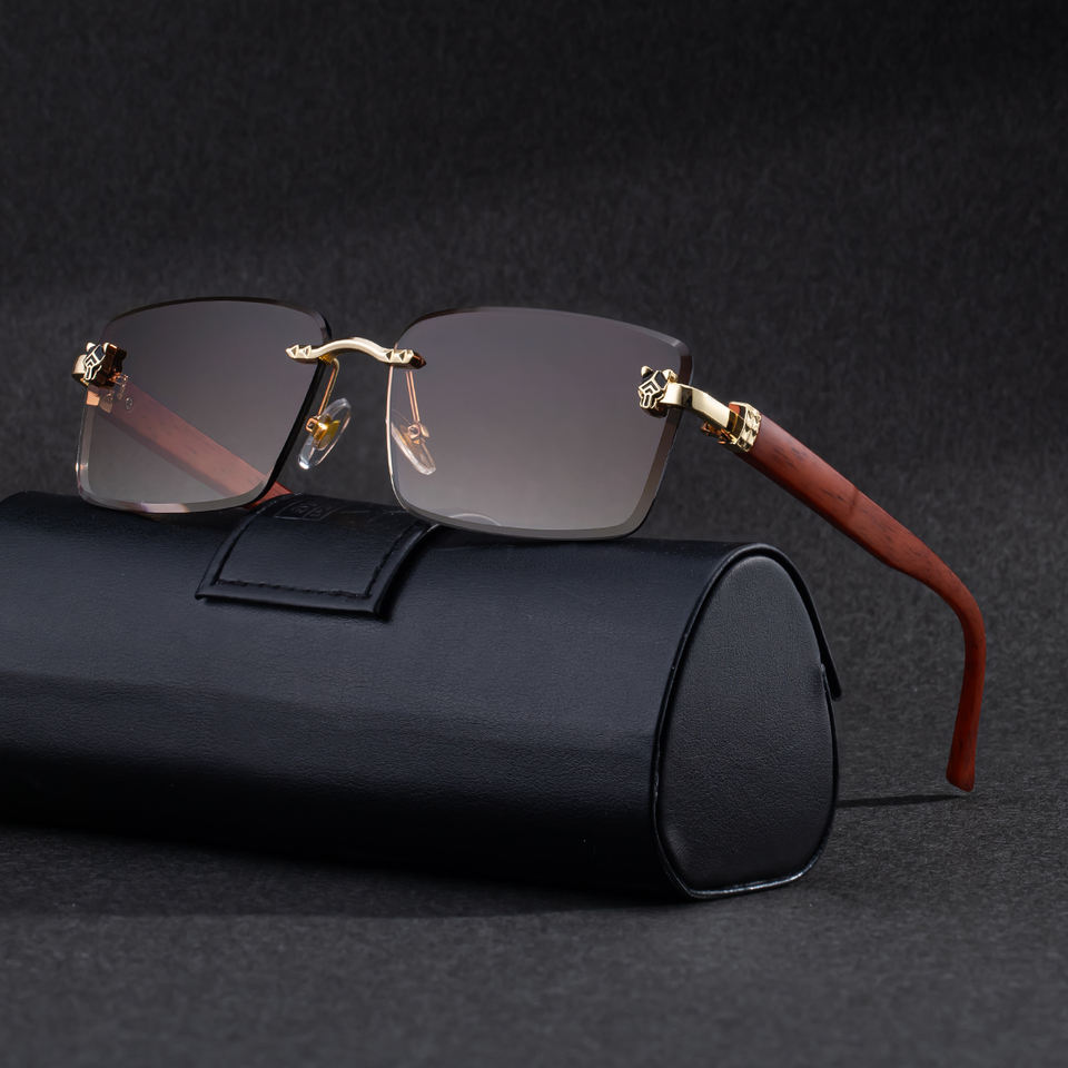 Lunettes de soleil Partagas Wholesale Retro Designer avec logo personnalisé, tête de léopard, couleurs grain de bois, sans monture, UV400, pour hommes