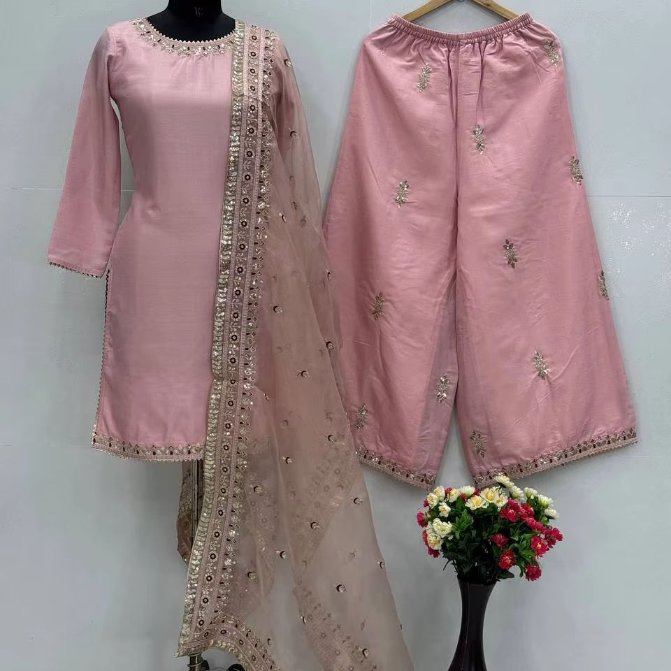 Ensemble Kurta-Pantalon Traditionnel en Soie Slim Fit pour Soirée avec Broderie