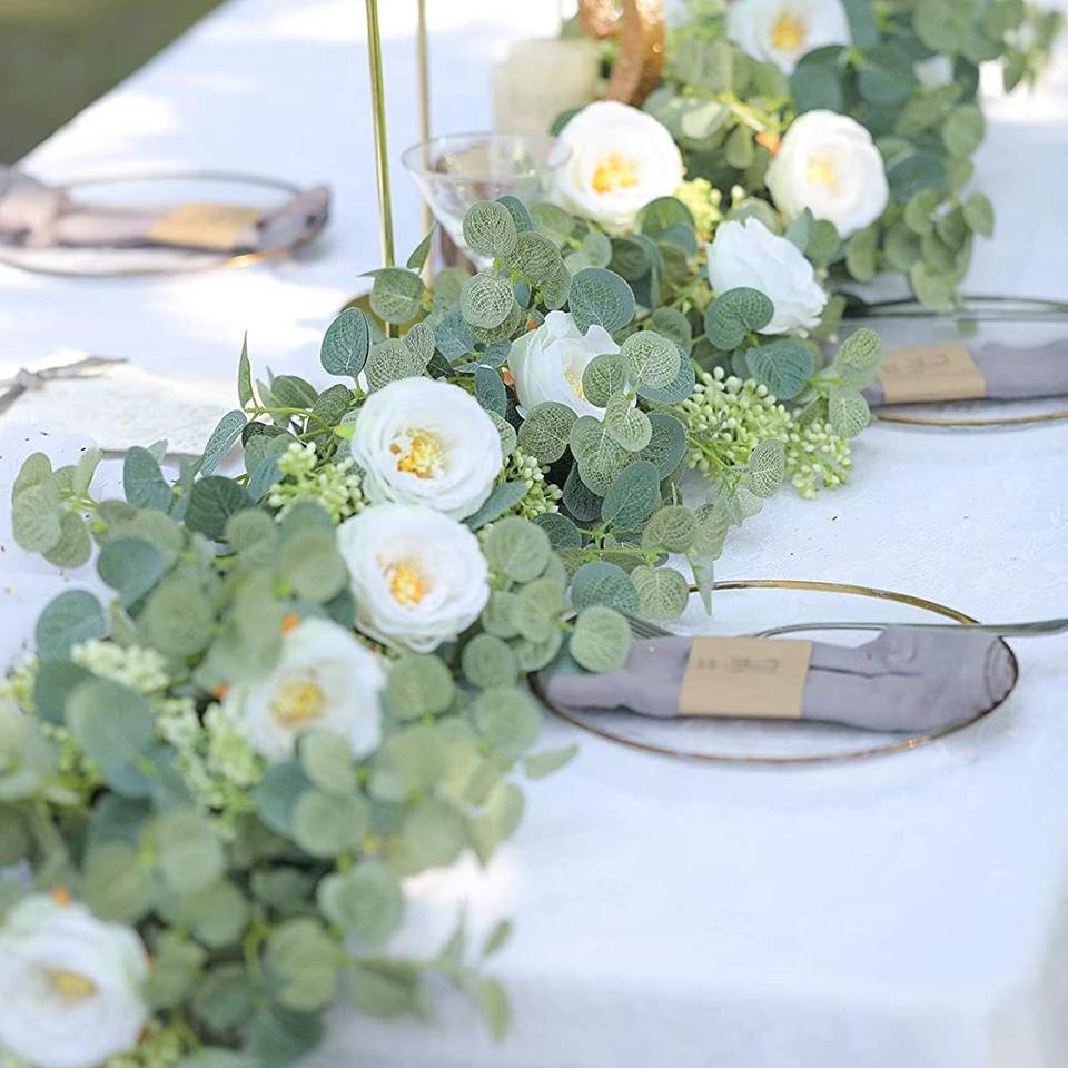 Guirlande d'eucalyptus pour décoration murale de table de mariage de fête, fleurs artificielles blanches, guirlande de roses pour la décoration