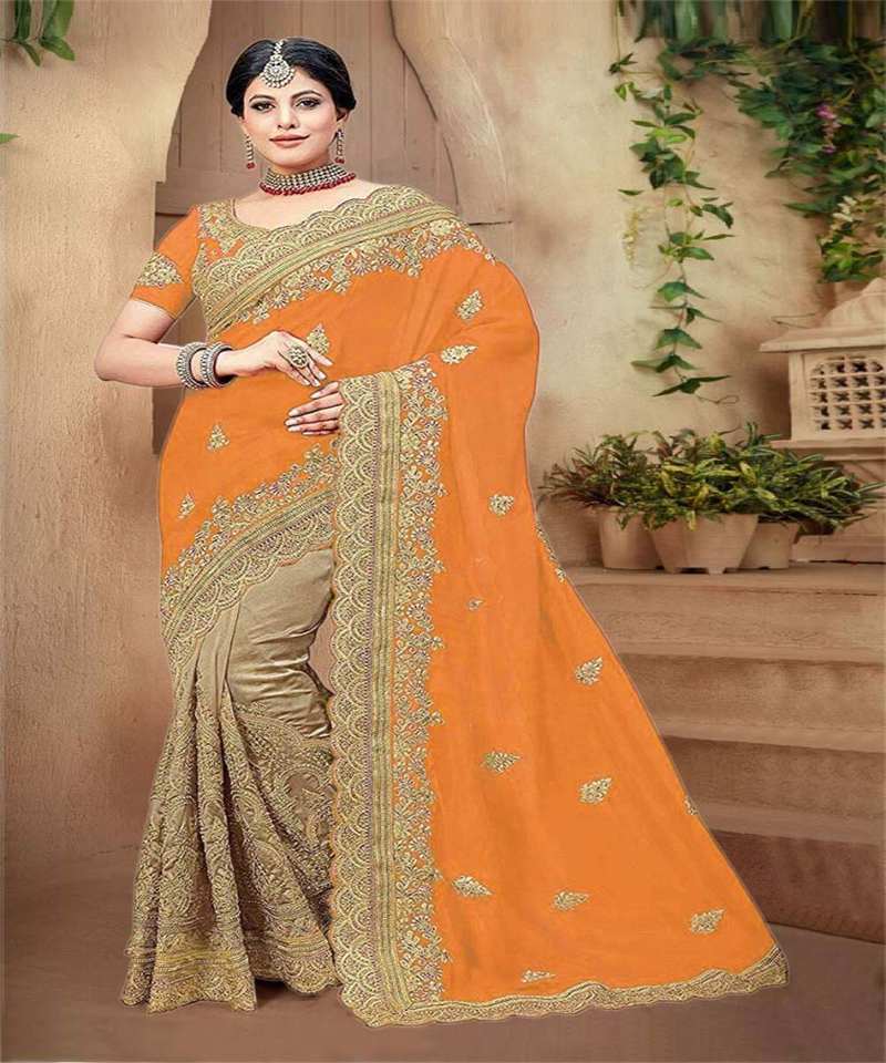 Party Wear Designer Embroidered Net Silk Flower Design Indian Ladies Wear Orange Color Saree with Blouse Piece Pearl Work Sari Garment