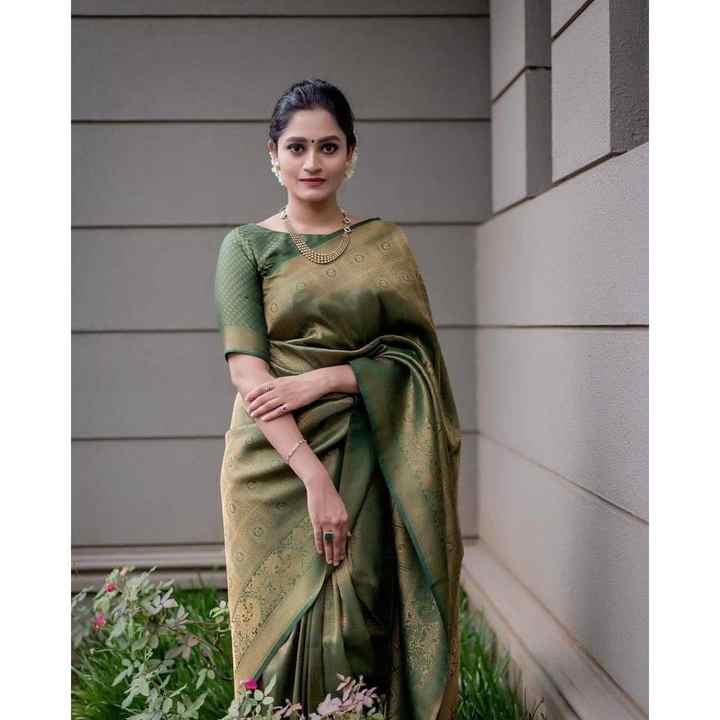 Party Wear Look Golden Zari Weaving Jacquard Saree in Dark Green
