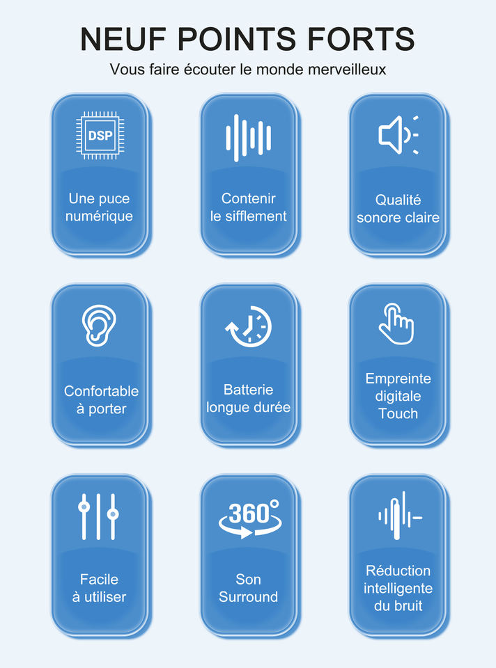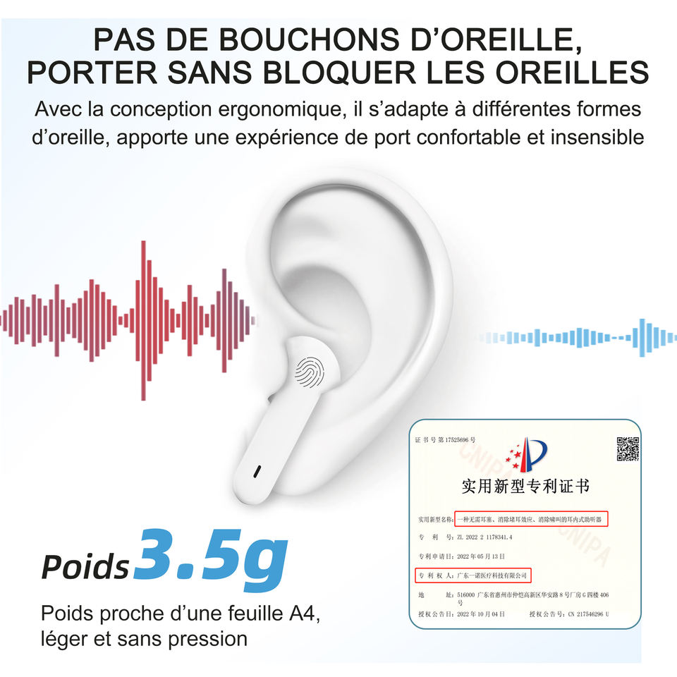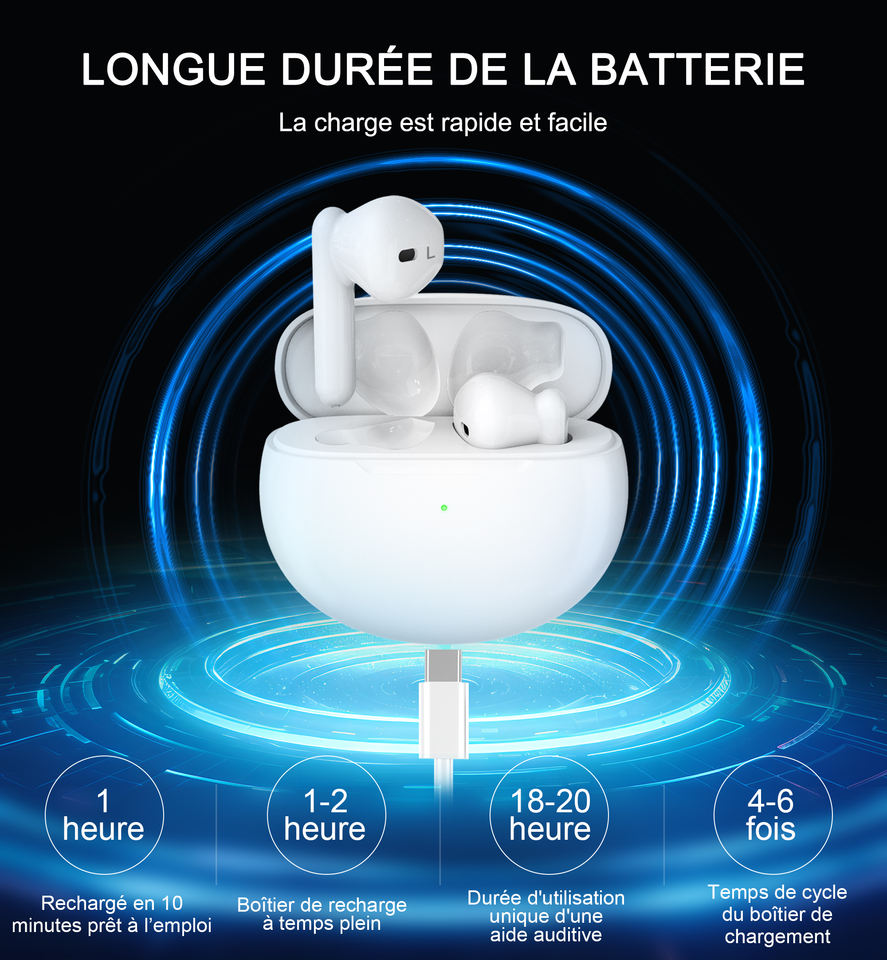 Pas de bouchons d'oreille, pas de sons agressifs, facile à utiliser. Aides auditives rechargeables pour les personnes âgées et l