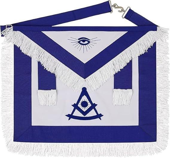 Tablier maçonnique de maître ancien, blanc, à franges, 100% cuir d'agneau, broderie à la main, bordure en ruban gros-grain bleu en polyester