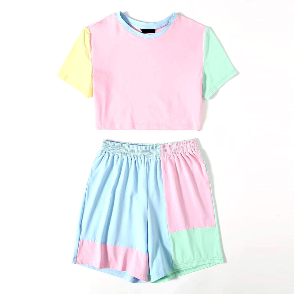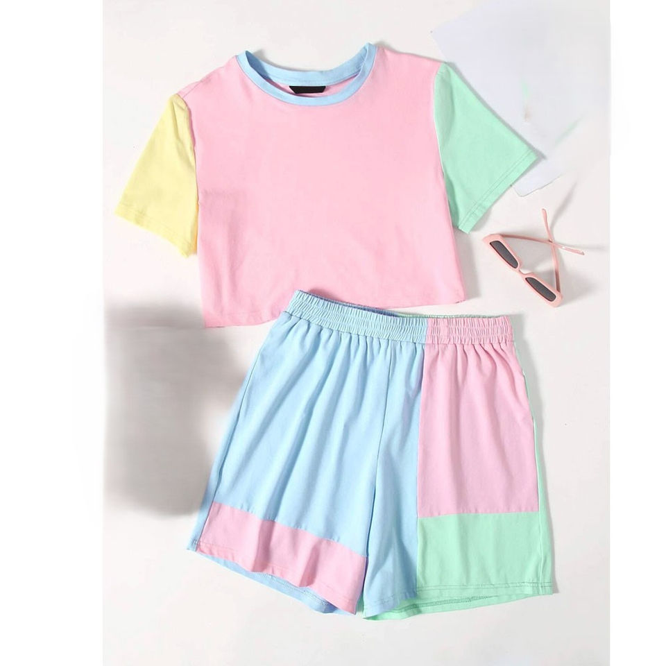 Ensemble haut court et short à blocs de couleur pastel-Ensemble deux pièces d'été à la mode pour dames ensembles courts Collection d'été au design tendance