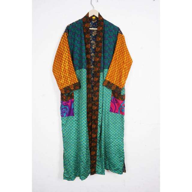 Robe longue en soie 100% patchwork à col en V avec cordon de serrage, manches trois-quarts, respirante et douce pour femmes