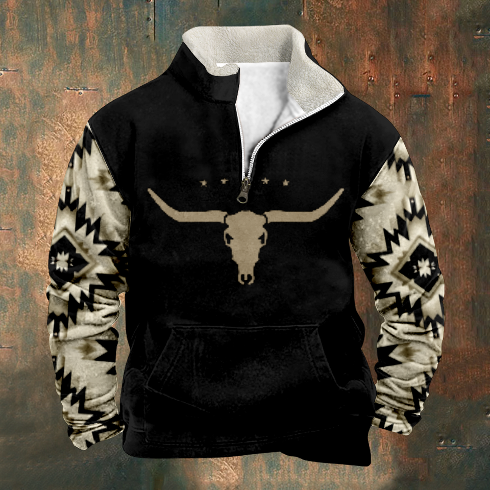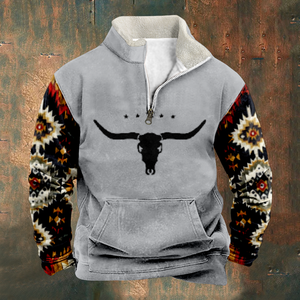 Sweat à capuche décontracté à col montant et fermeture éclair pour homme, motif graphique vintage en patchwork, os de taureau, manches longues, R217