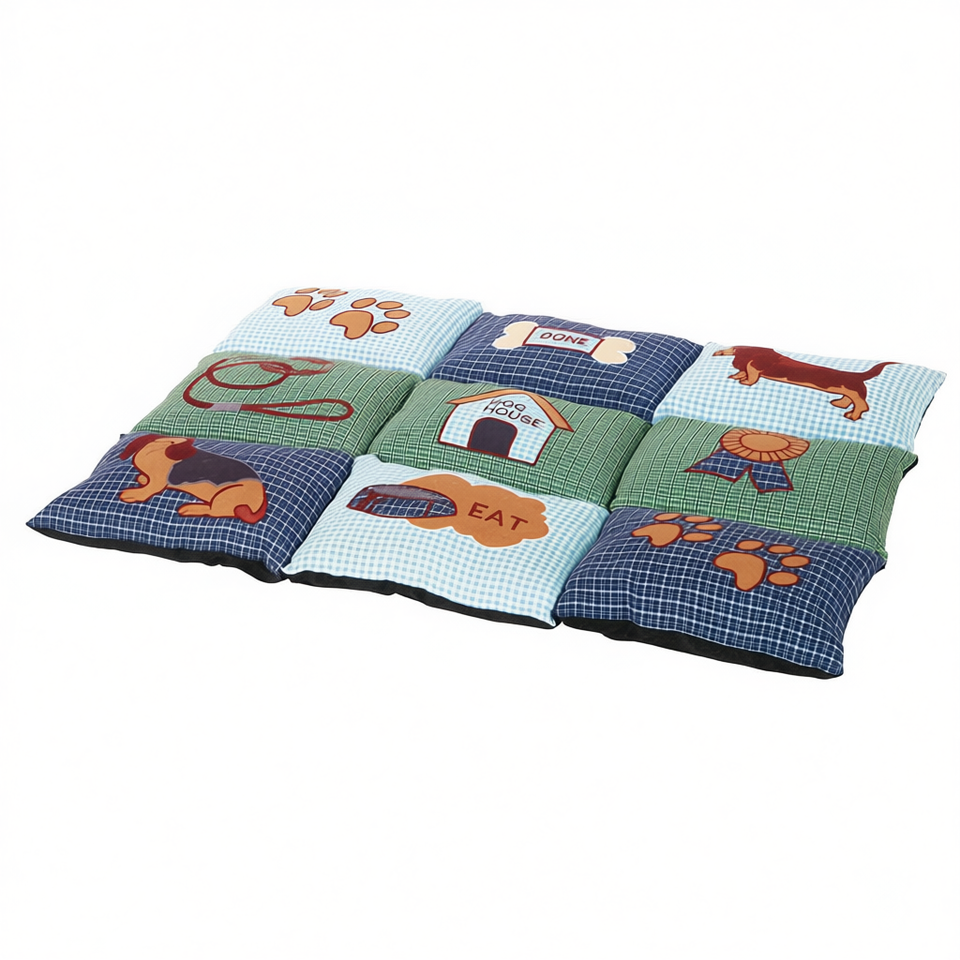Coussin matelassé pour chien, thème chien, patchwork, bleu vert, 80 x 55 cm