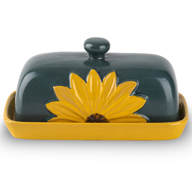 Beurrier en céramique à motifs, design bleu, orange, jaune, disponible à prix de gros, beurrier en céramique.
