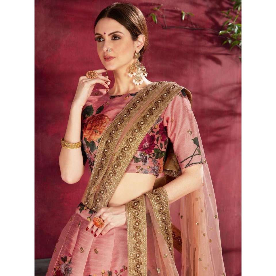 Peach Floral Print Banglori Silk Wedding Wear Lehenga Choli