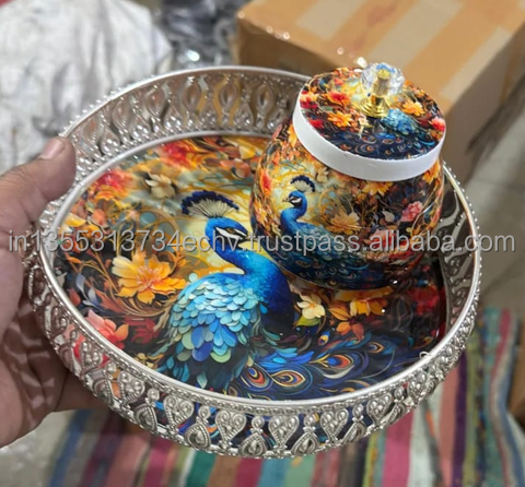 Plateau en métal à imprimé paon, cadeau religieux, plateau de mariage, cadeaux indiens, panier pour demoiselles d'honneur, panier pour fête de Haldi Mehndi, cadeau de retour
