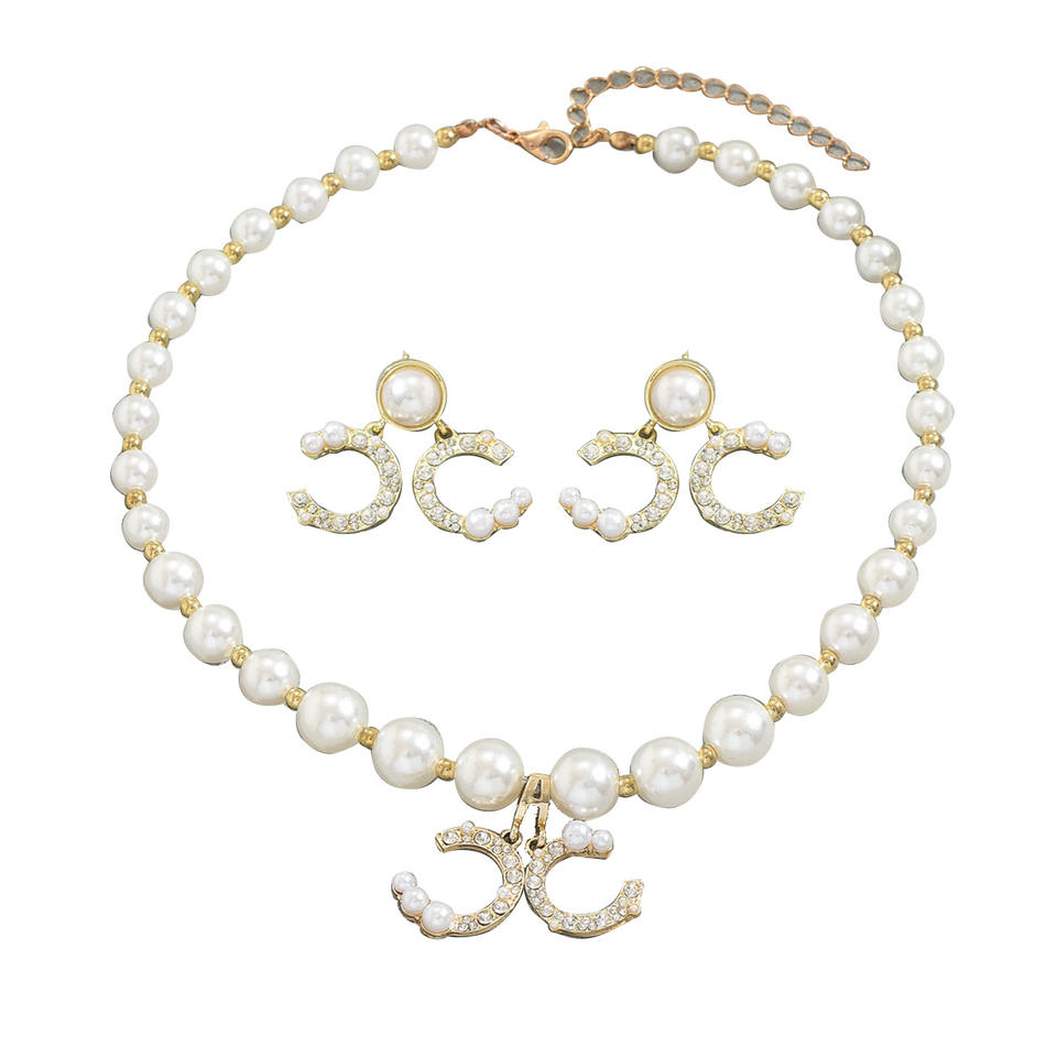 Ensemble de bijoux pour femmes élégants avec collier et boucles d'oreilles en or vintage à motif de cœur, pendentif double C, pour les accessoires de fête et de mariage