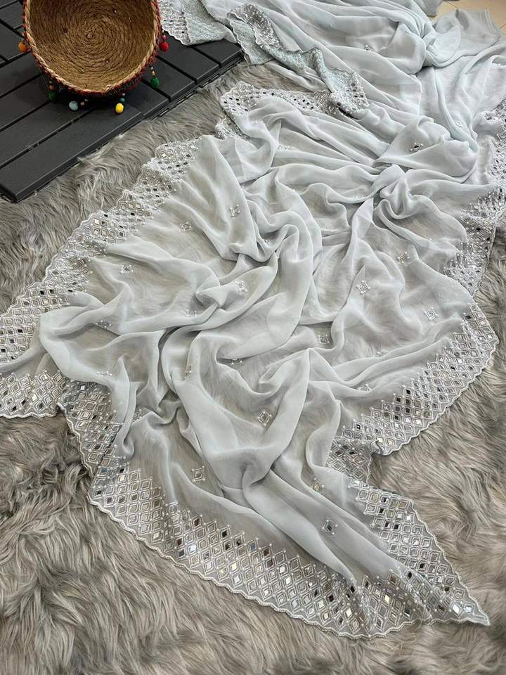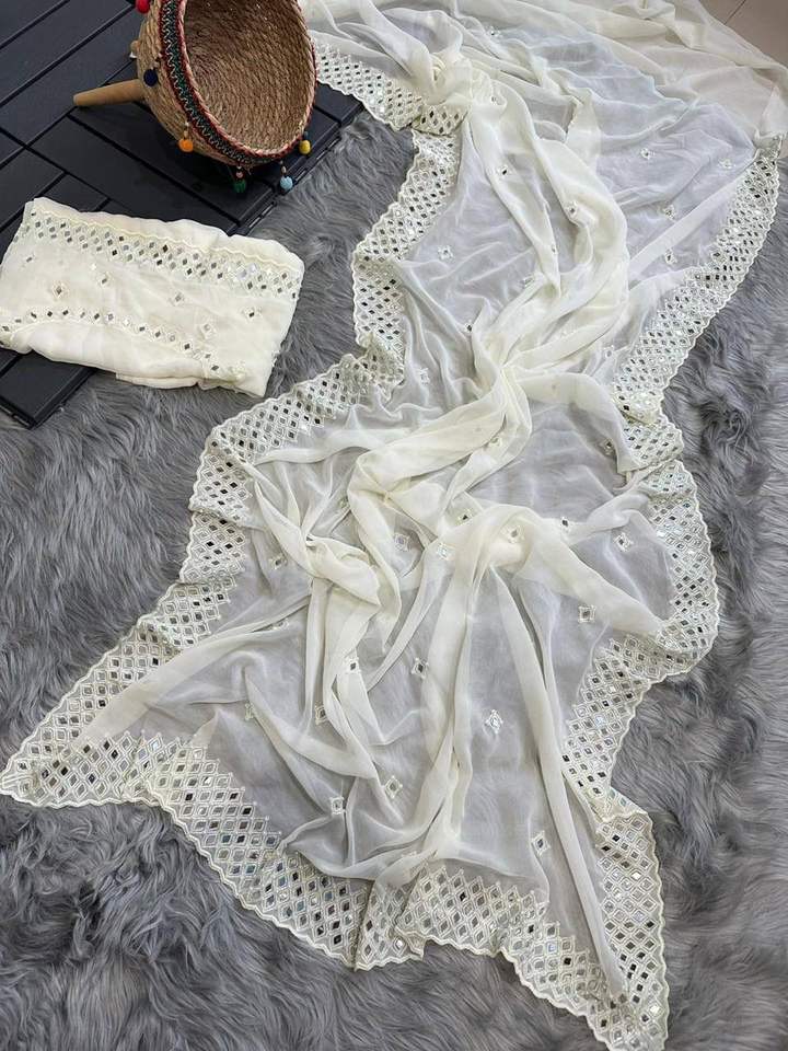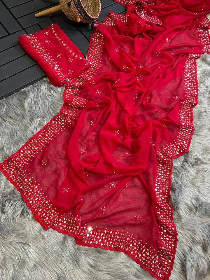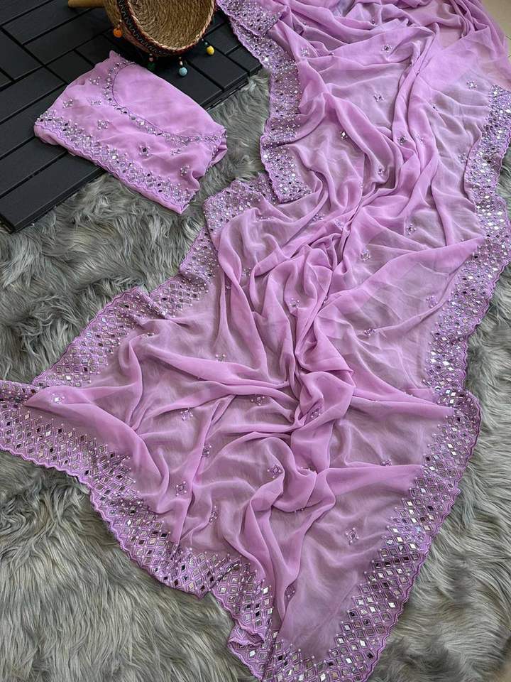 Sari en soie géorgette pure avec travail de perles, saris en miroir véritable avec pièces de blouse pour femmes