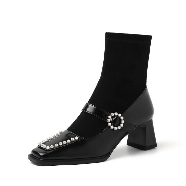 Bottines Mary Jane à bout carré en cuir de vachette artisanal, talon moyen épais, fermeture éclair latérale, élastiques, fines, courtes, pour femmes
