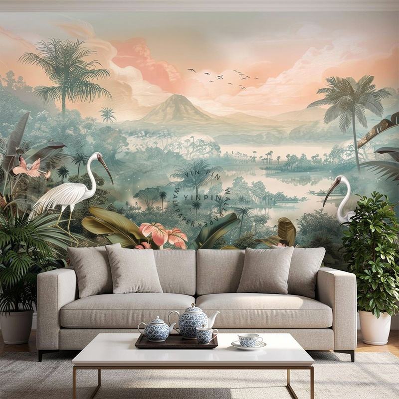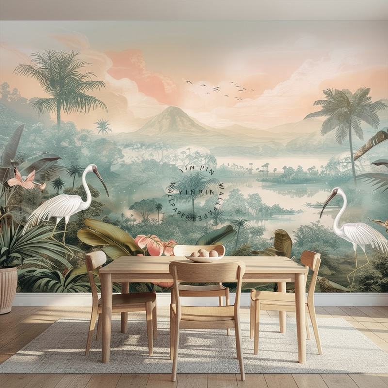 Papier peint mural traditionnel en vinyle à peler et à coller, paysage tropical paradisiaque, oiseaux exotiques, décoration murale pour la maison