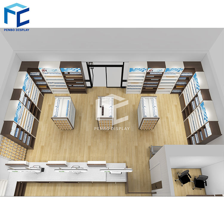 Penbo Wooden Metal Medical Display Rack Modern Wall Pharmacy Store Shelf for Pharmacy Store