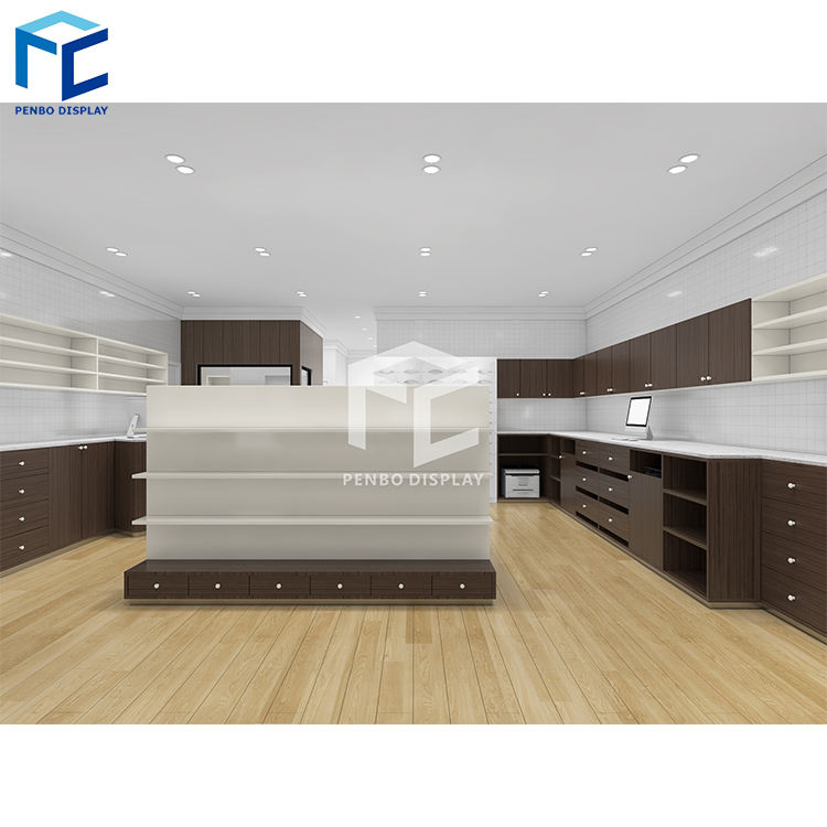 Penbo Wooden Metal Medical Graded Pharmacy Shelves Store With Drawers