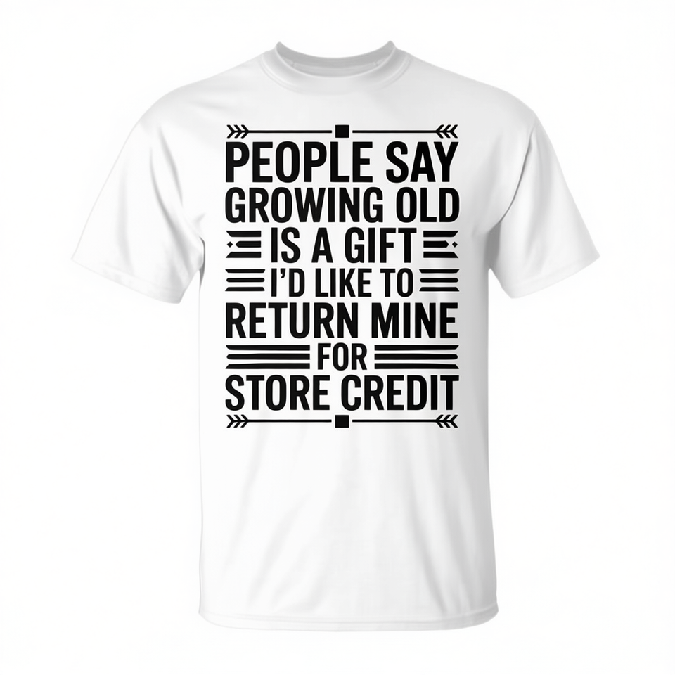 Les gens disent que le vieillissement est un cadeau, et que j'aimerais le rembourser en échange d'un bon de réduction en magasin - T-shirt