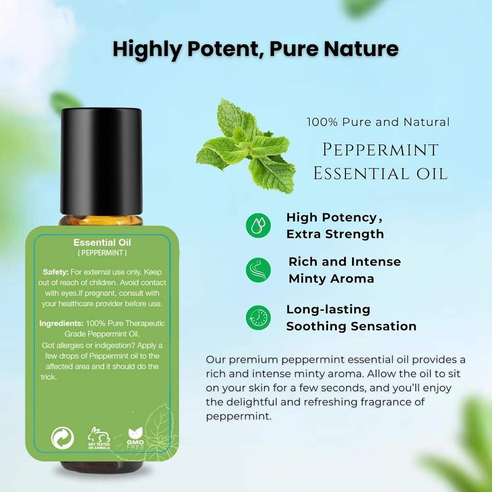 Huile essentielle de menthe poivrée Roll on-Huile essentielle de menthe poivrée pour les maux de tête Migraine-Rouleau de mélange de 10ml avec huile de menthe