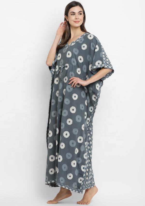 Classique gris et ivoire main bloc imprimé col en v caftan robe 100% coton doux décontracté grande taille pour l'été confort heureux