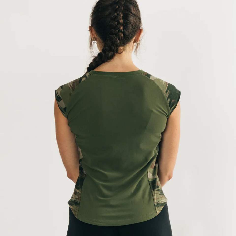 T-Shirt camouflage en toile d'olive pour femme, 95% coton, 5% Spandex, manches cape ajustées, en forme de Raglan, encolure ras du cou