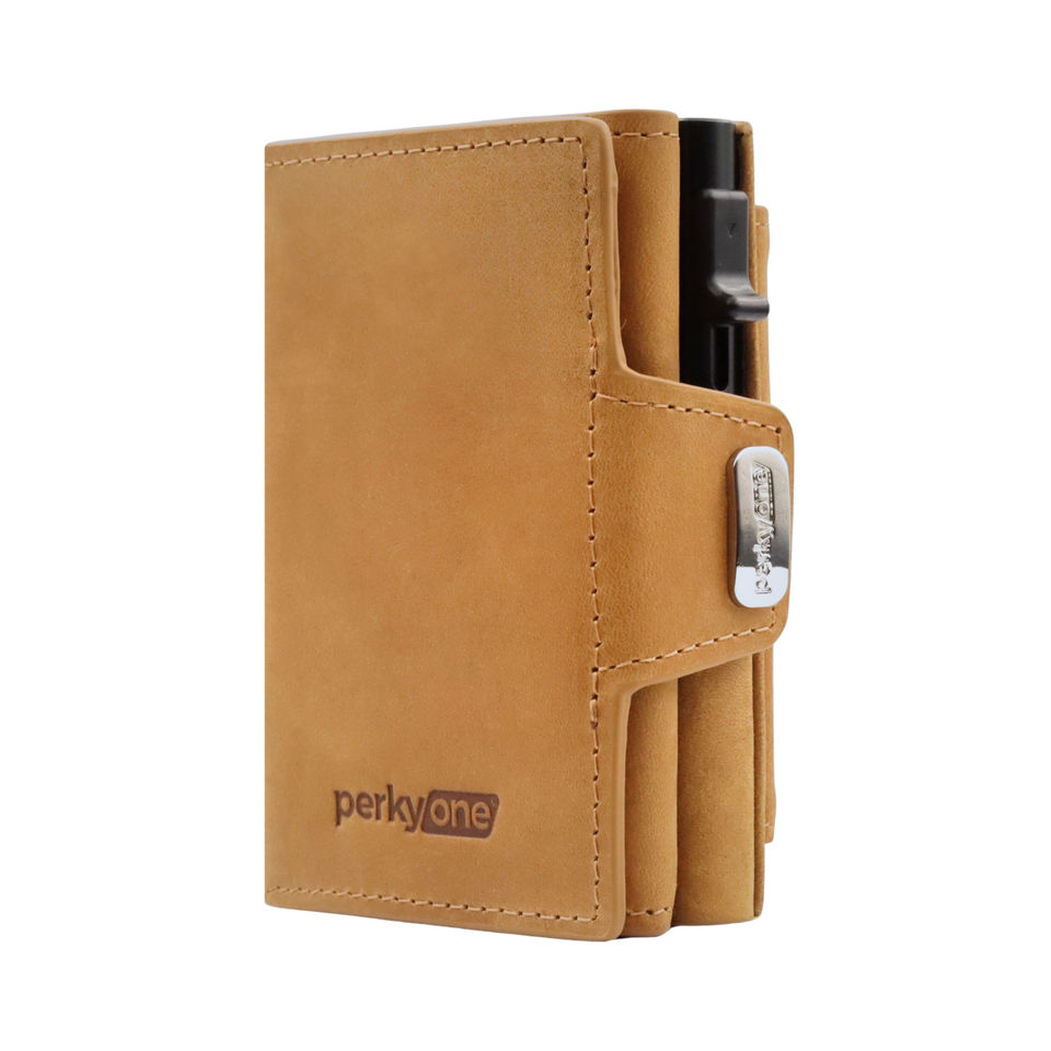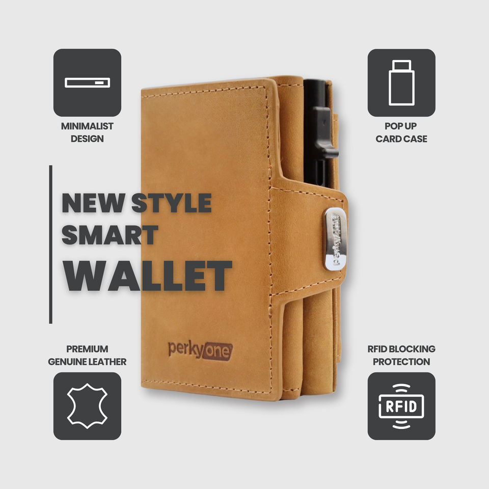 Perkyone Dapper Everyday Compact Genuine Leather Wallet Slim Long Design Zipper Closure RFID Feature Open Type Logo Pattern